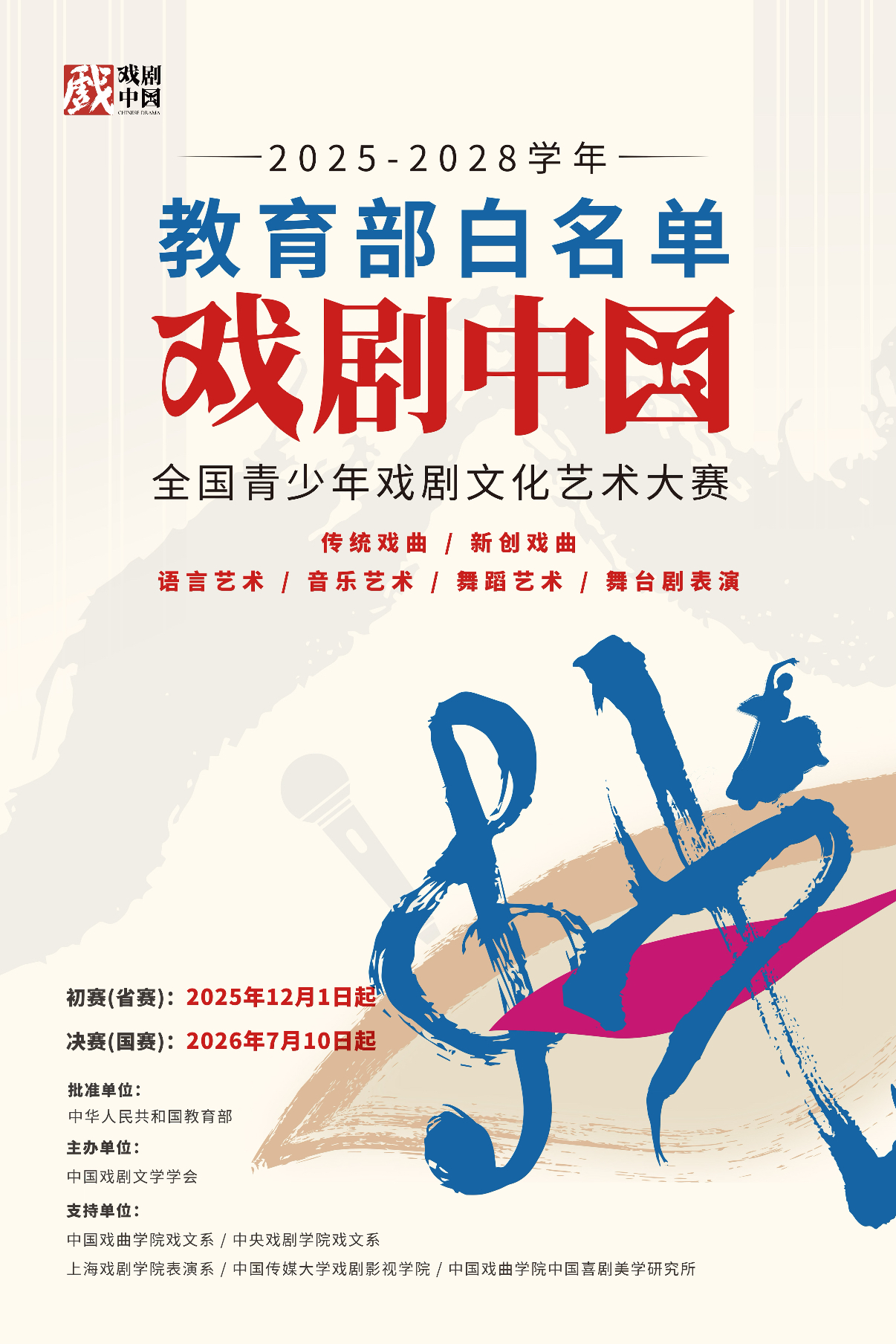 为深入贯彻落实中共中央办公厅、国务院办公厅《关于全面加强和改进新时代学校美育工作的意见》精神,全面落实教育部《关于全面实施学校美育浸润行动的通知》要求,以戏剧教育为载体培育学生“审美感知、艺术表现、文化理解”等核心素养,并积极响应《关于支持戏曲传承发展的若干政策》号召,构建全社会关注戏剧艺术、参与文化遗产传承的良好生态,按照《教育部办公厅关于公布2025—2028学年面向中小学生的全国性竞赛活动的通知》,中国戏剧文学学会将举办2025-2026学年“戏剧中国”全国青少年戏剧文化艺术大赛。