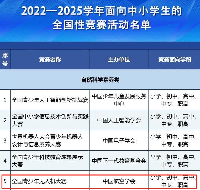 在2022年教育部公布的2022-2025学年面向中小学生的全国性竞赛活动名单,全国青少年无人机大赛也位列其中。
