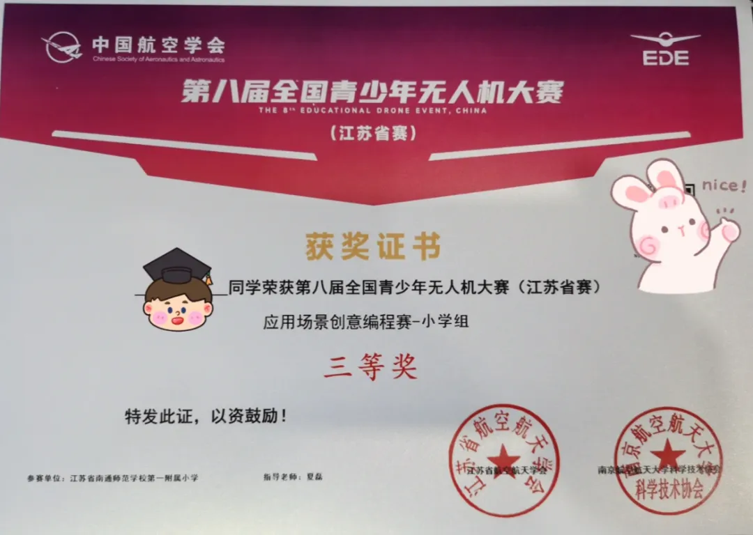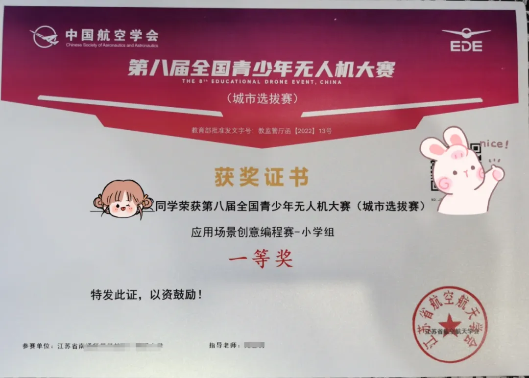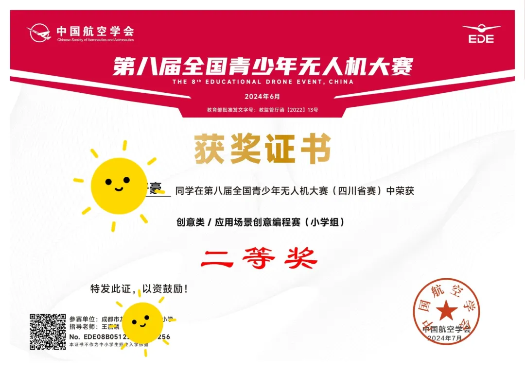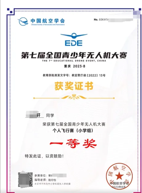 全国青少年无人机大赛获奖荣誉证书样本(往届)